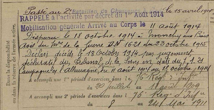 Il disparaît le 18 octobre 1914 à Monchy-au-Bois dans le Pas-de-Calais à l’âge de 32 ans.
