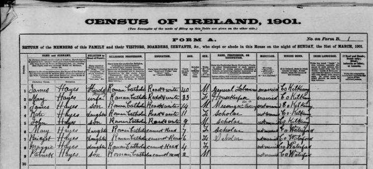 One census in Ireland in 1901 tells us that Patrick had 5 sisters, Kate, Mary, Bridget, Maggie, Eileen, and 4 brothers, James, John, Joseph, William, all born between 1887 and 1909.